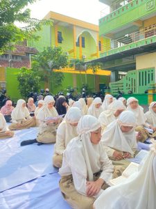 Acara dimulai dengan pembacaan surat Al-Waqi’ah secara bersama-sama. Lantunan ayat suci Al-Qur’an terdengar merdu dan serempak, menciptakan suasana yang tenang dan menyejukkan hati. Para siswa terlihat khusyuk mengikuti setiap bacaan, dipandu oleh para guru yang berada di barisan depan.