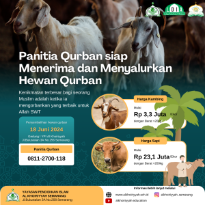 Semarang, 4 Juni 2024. LDIA Al Khoiriyyah tahun ini seperti biasa mengadakan agenda tahunan yaitu kegiatan Idul Adha yang bertempat di gedung 1, alhamdulillah pembentukan panitia sudah terbentuk pada tahun ini diketuai oleh ustadz Husni Robith S,Pd.I dari Madrasah Ibtidaiyyah 02 semarang, semoga kegiatan tahun ini berjalan dengan lancar dan tanpa halangan. Ketua panitia idul qurban tahun ini berharap kepada masyarakat setempat al khoiriyyah dapat menitipkan dan menyumbangkan hewan qurban terbaiknya kepada YPI Al Khoiriyyah. Pada tahun ini panitia qurban menginformasikan untuk harga kambing sebesar 3,3 juta rupiah dan untuk harga sapi sebesar 23,1 juta rupiah.